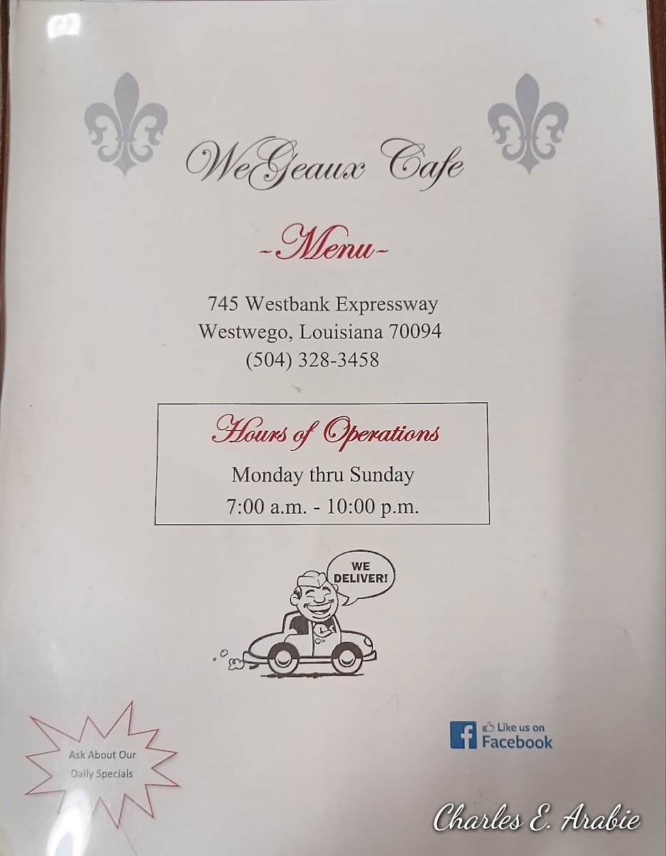 We're in from out of state & staying on the NShore. We met up with 2 from E Bank & 2 from W Bank, (6 total) Good B'fast for all...my 1st time trying B'fast! We like WGxC so much, that after visiting with family, B4 heading to the NShore, we went back for supper! 2 bowls of Gumbo (chicken & seafood) served with potato salad & french bread...we also shared small onion rings. All was very good! Service also great! We highly recommend! I turned my friend from E Bank on to WGxC a couple of yrs ago & she stops in often when on the W Bank! Some of the best places to eat, in my opinion, are the smaller, low key places like WeGeaux Cafe...keep it up!!!